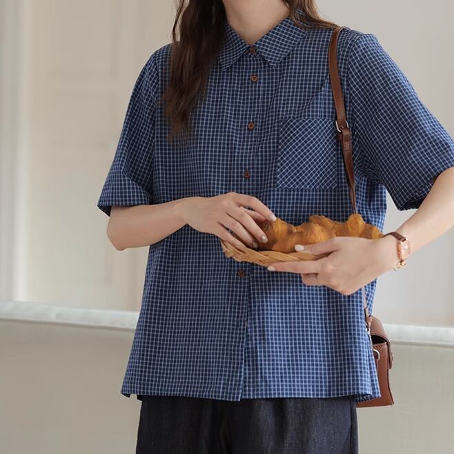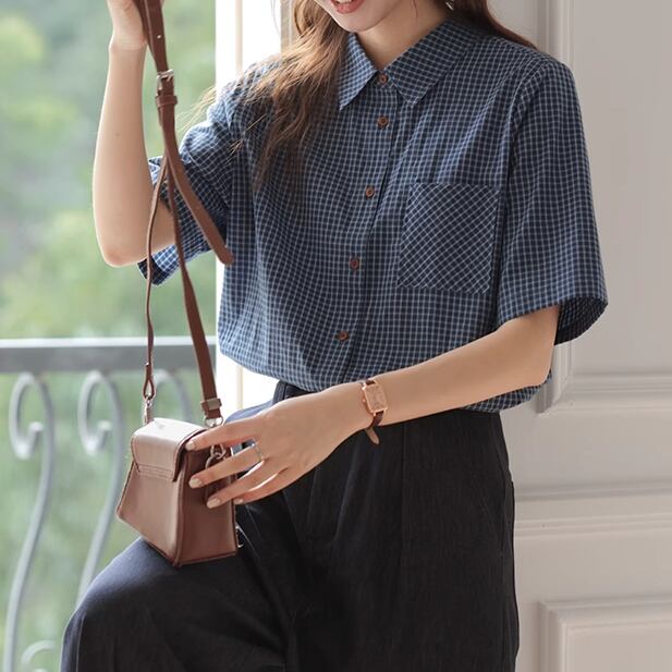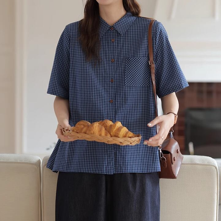 ラウンドネックレトロチェック柄ブラウス ・8142