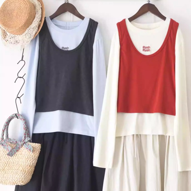 【2点セット】3色/ロゴ刺繍トップス+ビスチェ ・9927