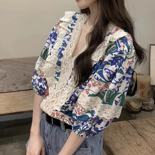 ラウンドネックレトロチェック柄ブラウス ・8142