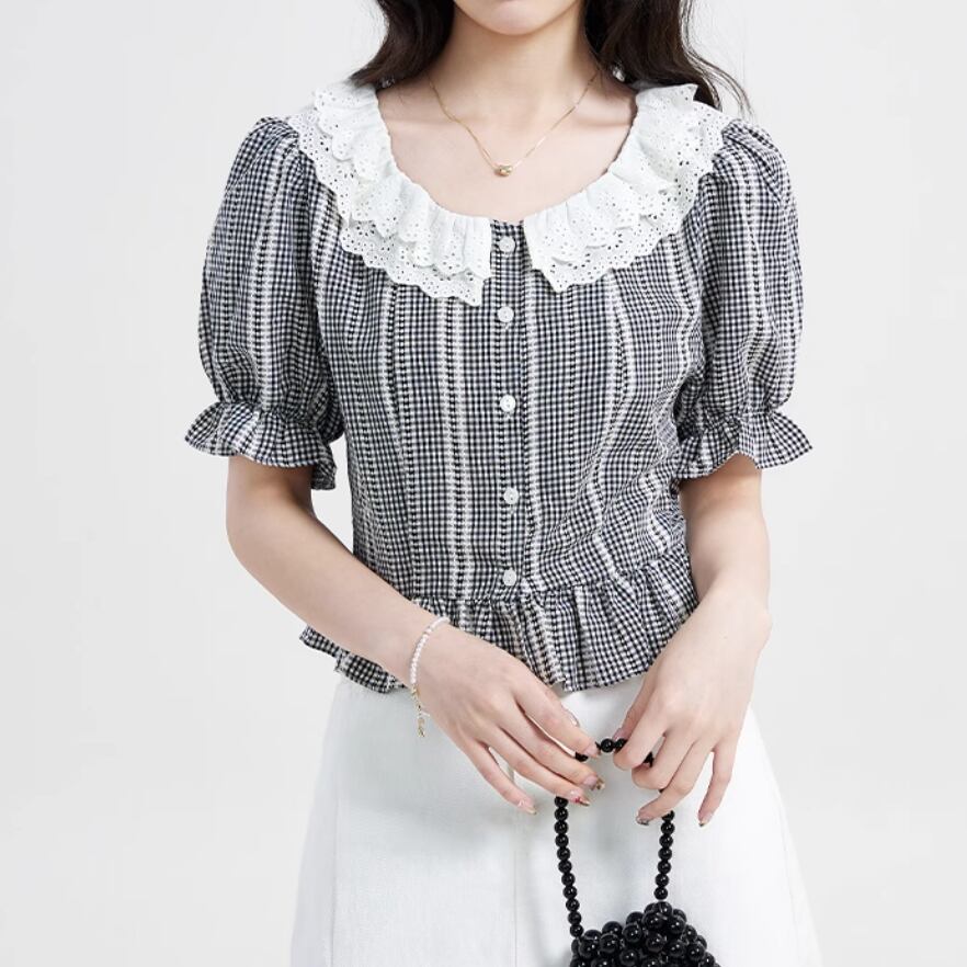 ラウンドネックレトロチェック柄ブラウス ・8142
