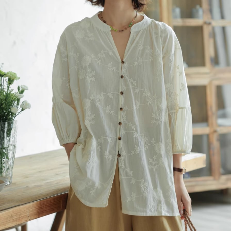 ラウンドネックレトロチェック柄ブラウス ・8142