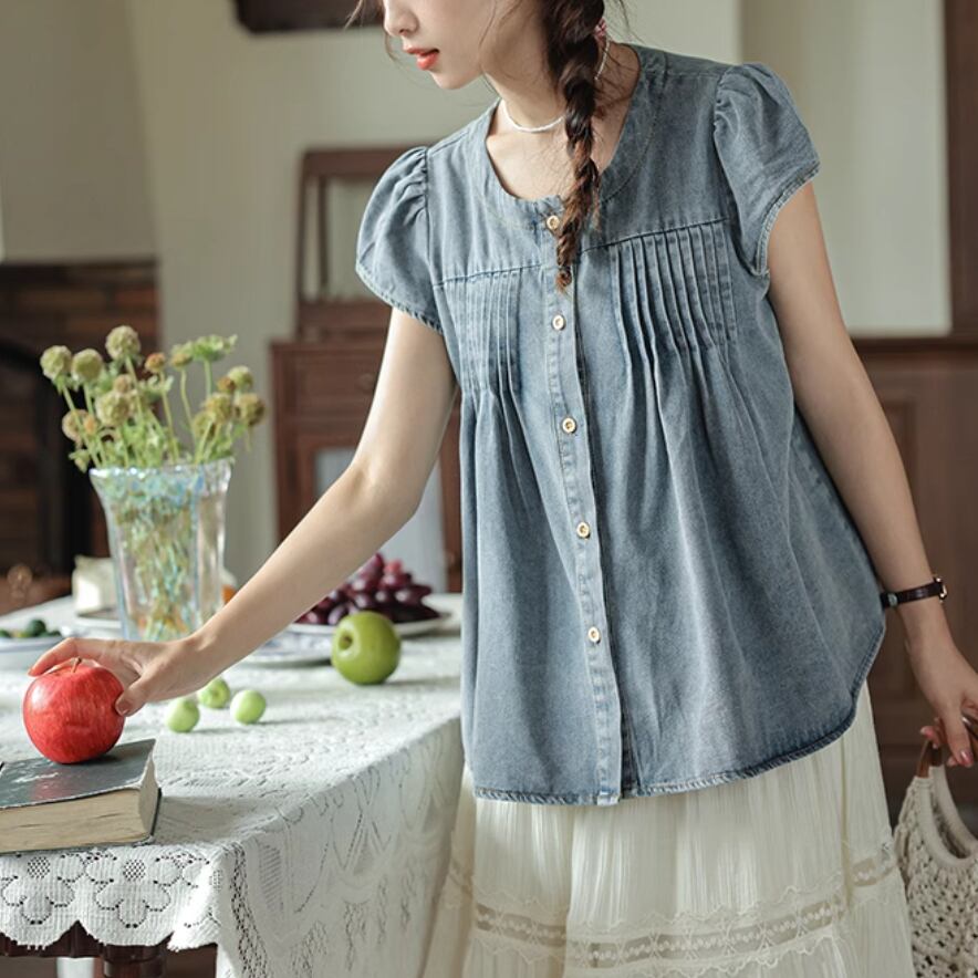 ラウンドネックレトロチェック柄ブラウス ・8142