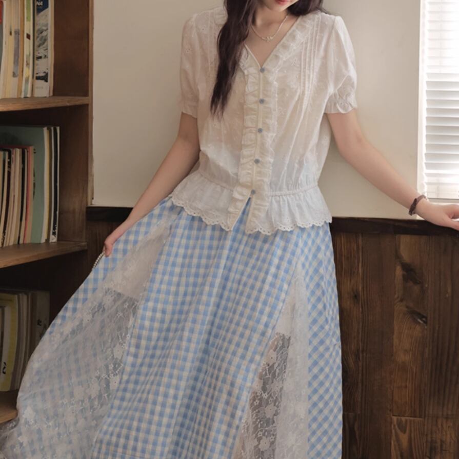 ラウンドネックレトロチェック柄ブラウス ・8142