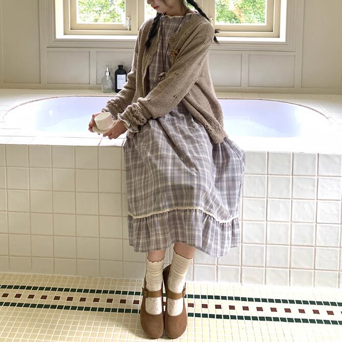 3色/レトロチェック柄シャツロングワンピ ・8186
