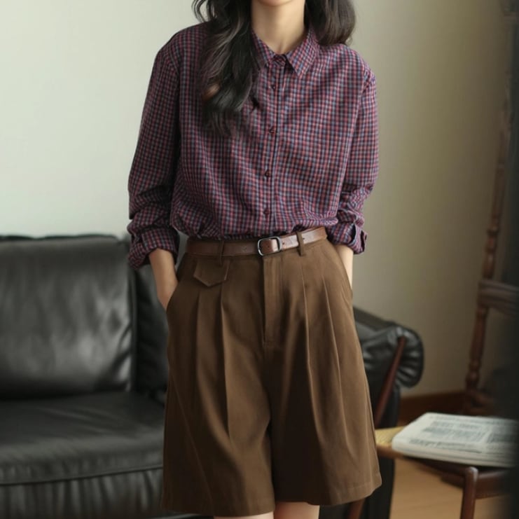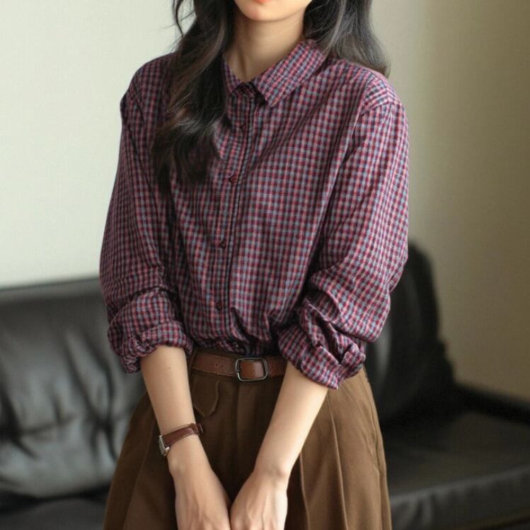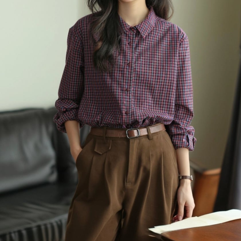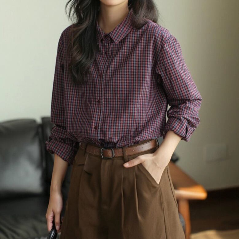 ラウンドネックレトロチェック柄ブラウス ・8142