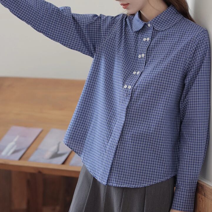 ラウンドネックレトロチェック柄ブラウス ・8142