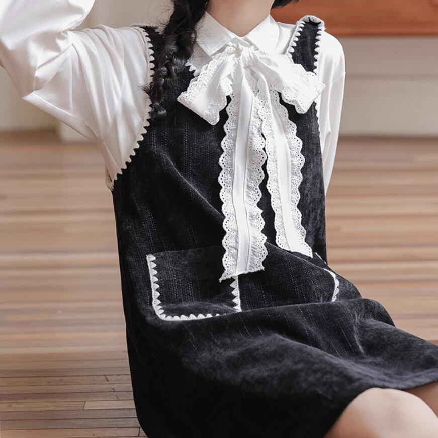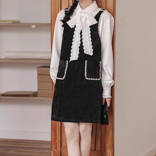 【2点セット】レースネックトップス+サイドリボンベスト ・4338
