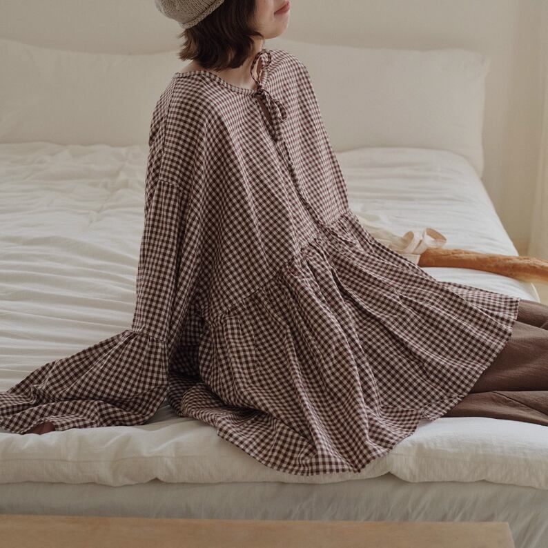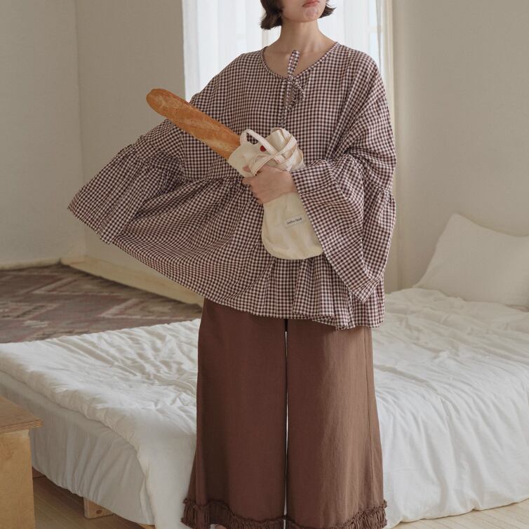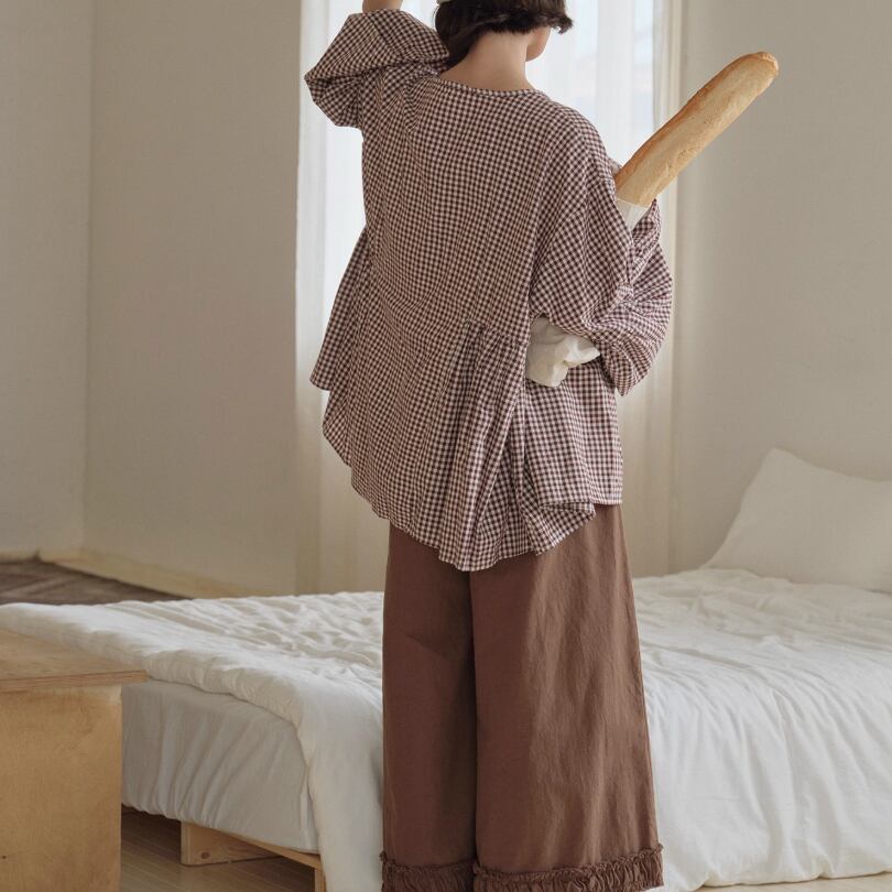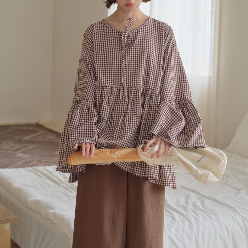 ラウンドネックレトロチェック柄ブラウス ・8142