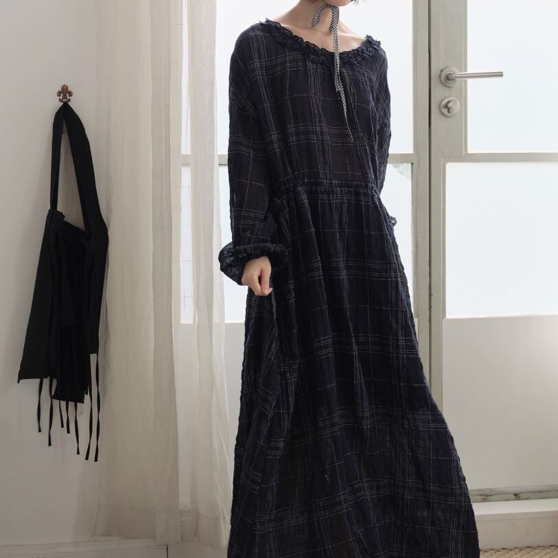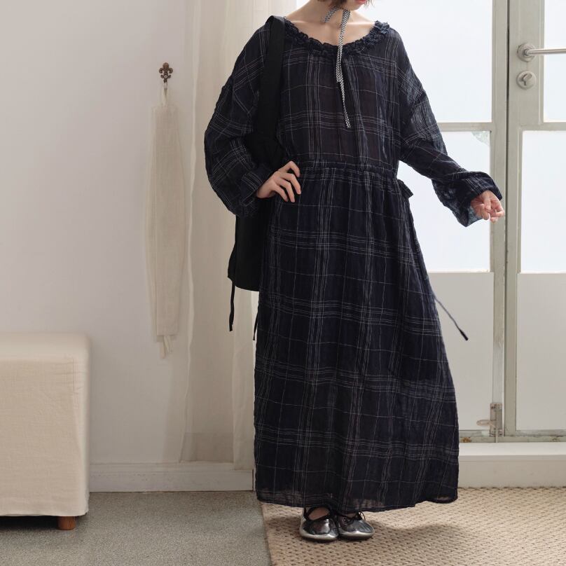 3色/レトロチェック柄シャツロングワンピ ・8186