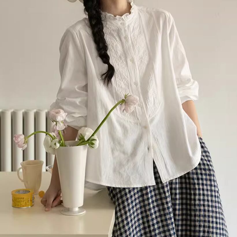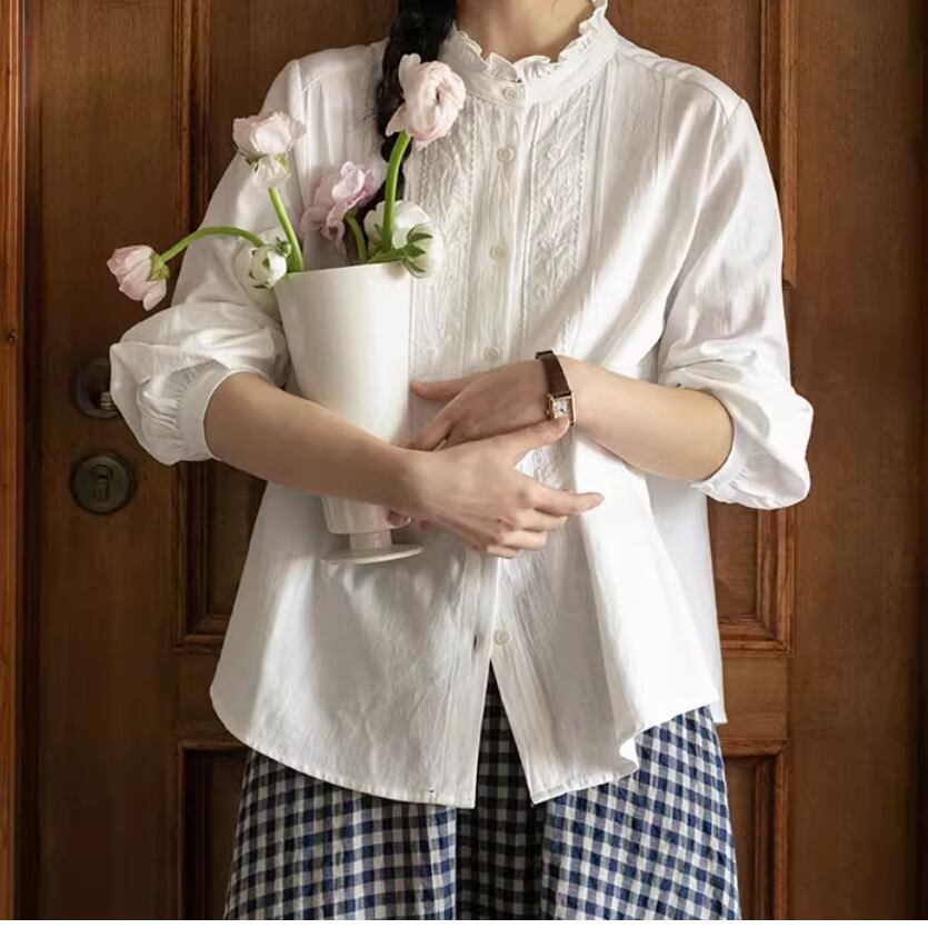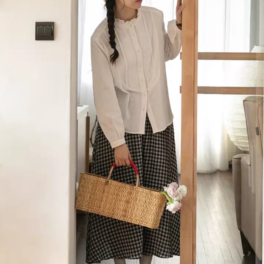 ラウンドネックレトロチェック柄ブラウス ・8142