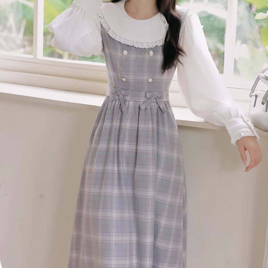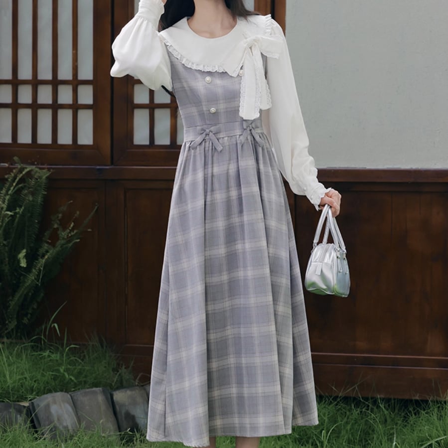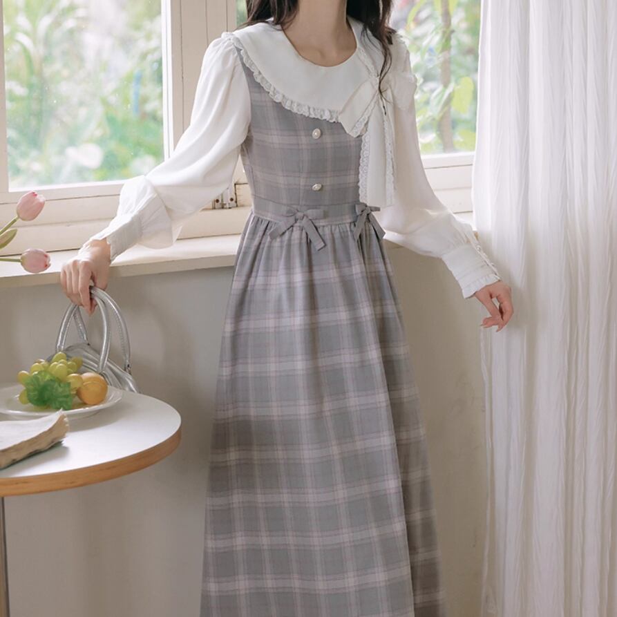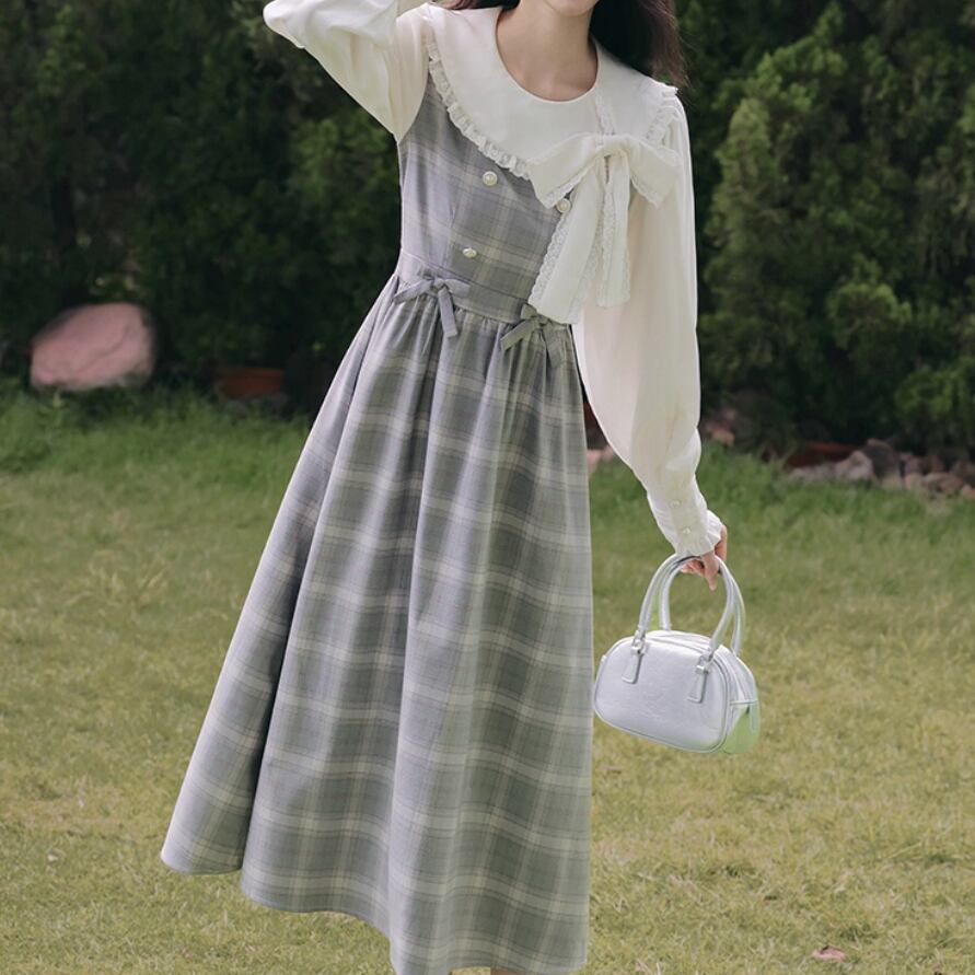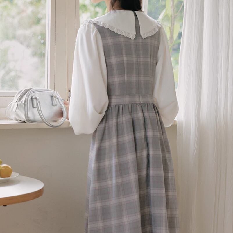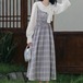 3色/レトロチェック柄シャツロングワンピ ・8186