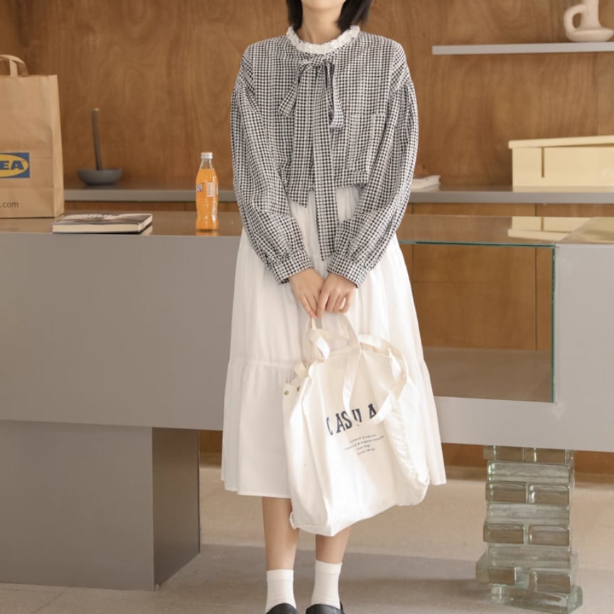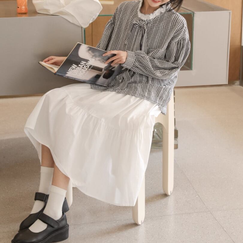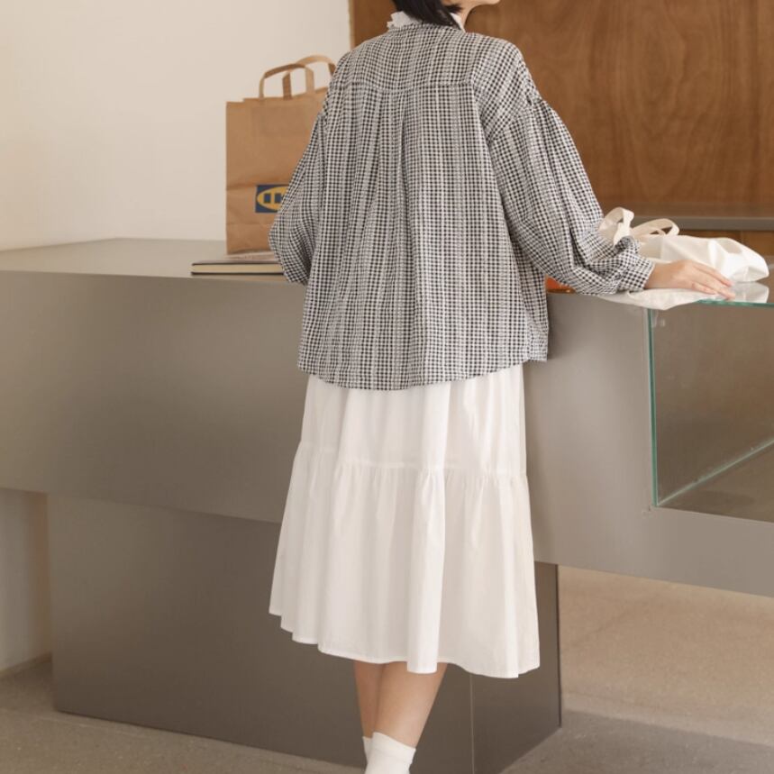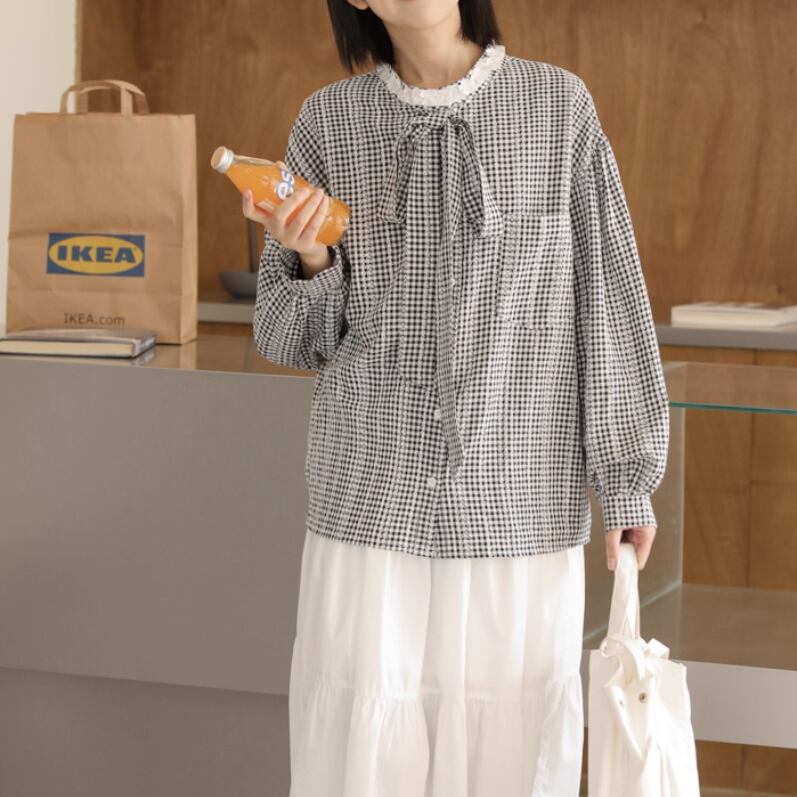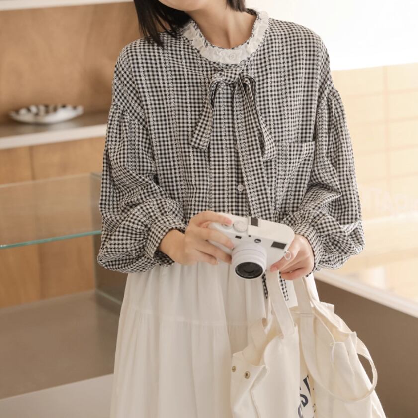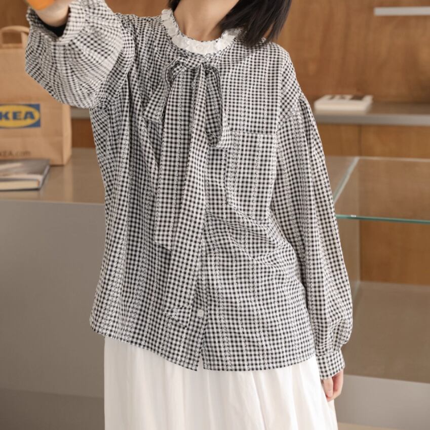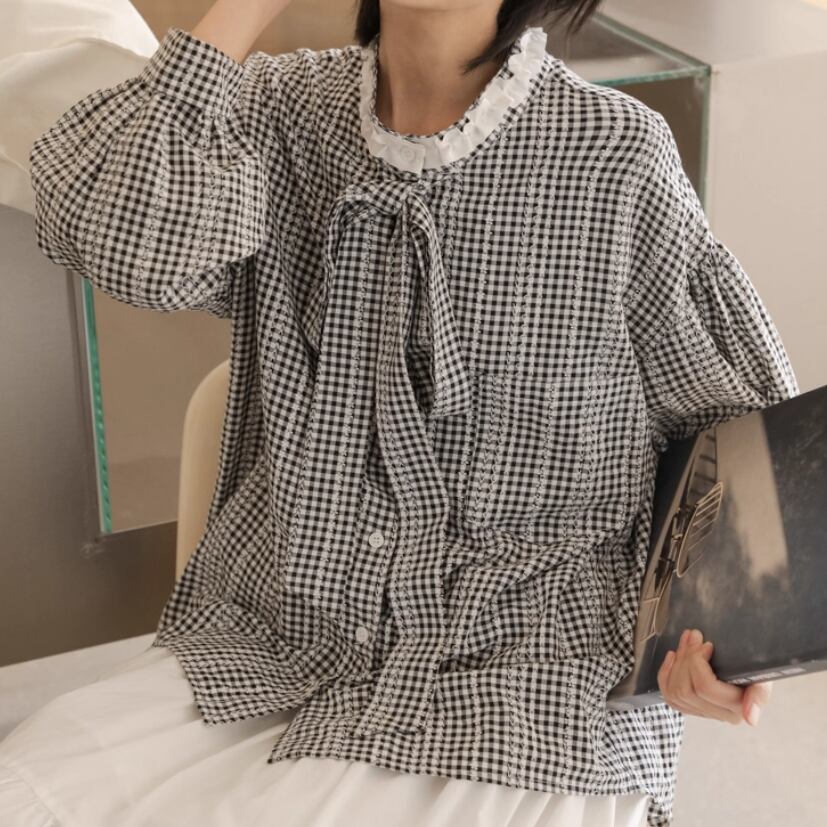 ラウンドネックレトロチェック柄ブラウス ・8142