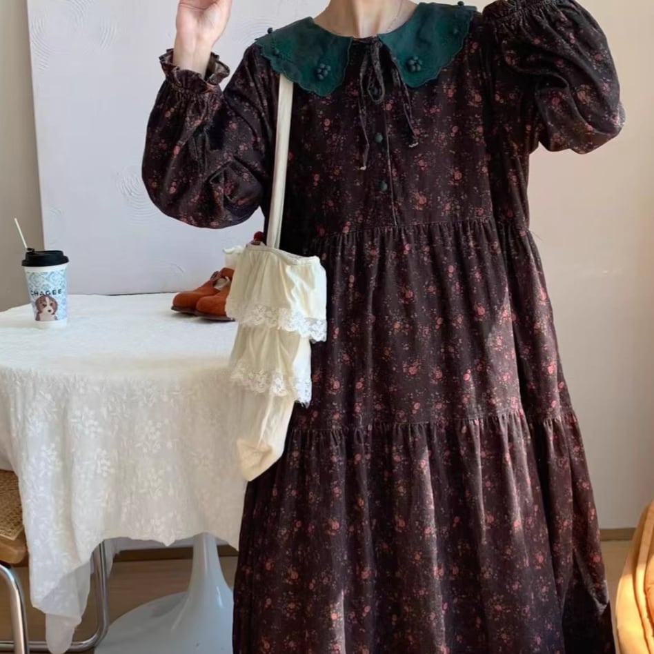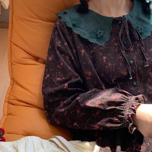 レース貼りコーデュロイロングワンピ ・6410
