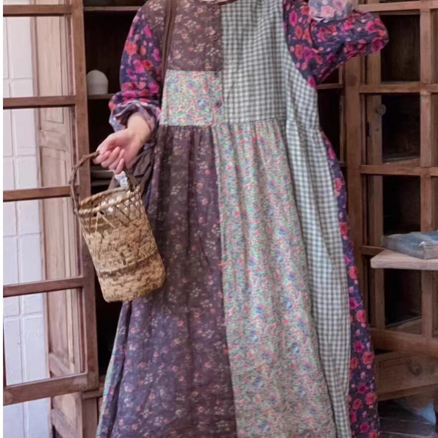 3色/レトロチェック柄シャツロングワンピ ・8186