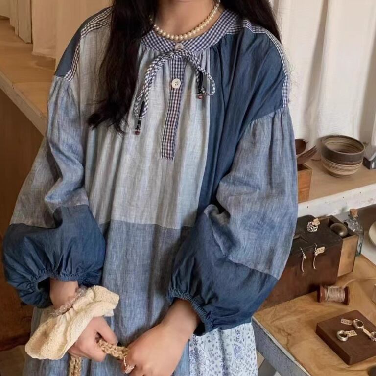 3色/レトロチェック柄シャツロングワンピ ・8186