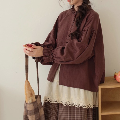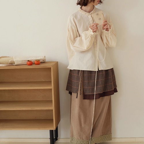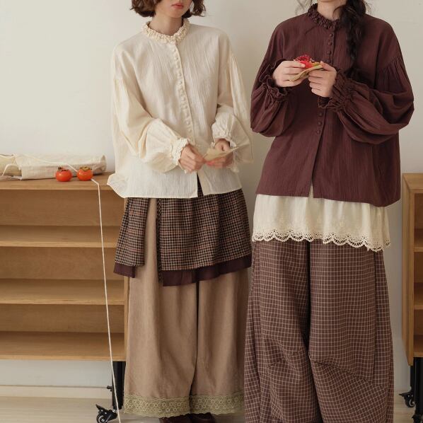 ラウンドネックレトロチェック柄ブラウス ・8142