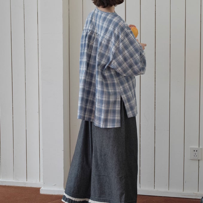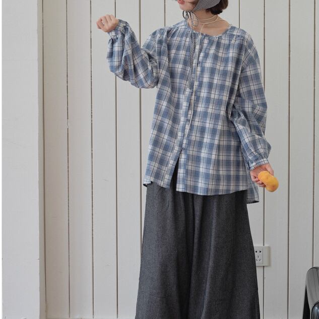 ラウンドネックレトロチェック柄ブラウス ・8142