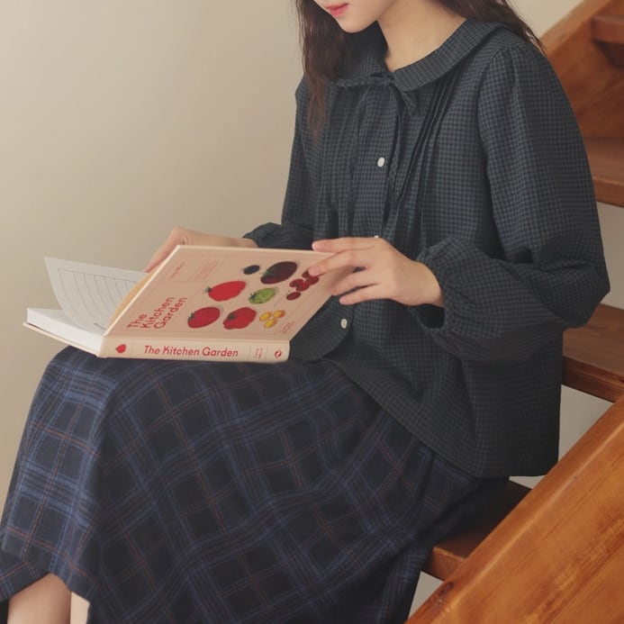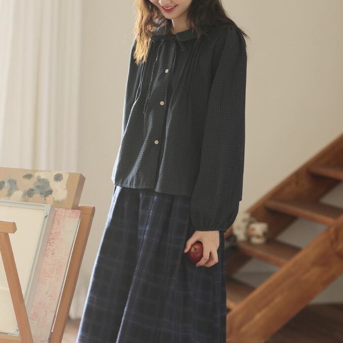 ラウンドネックレトロチェック柄ブラウス ・8142
