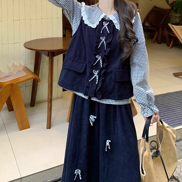 【3点セット】ニットベスト+トップス+タックスカート ・9602