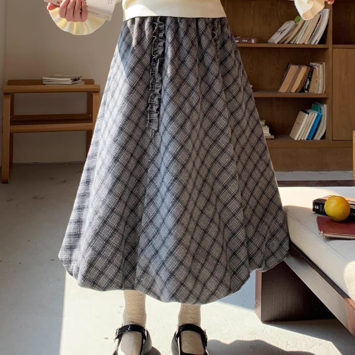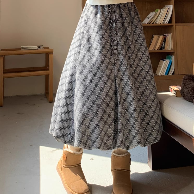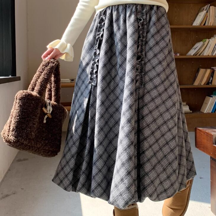 裾レースチェック柄フレアスカート ・9286