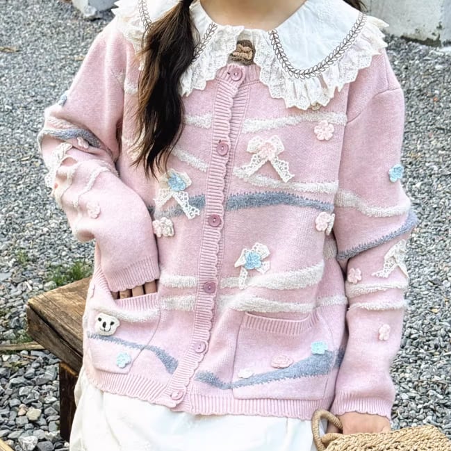 3色/フラワー刺繍ニットカーデ ・8907
