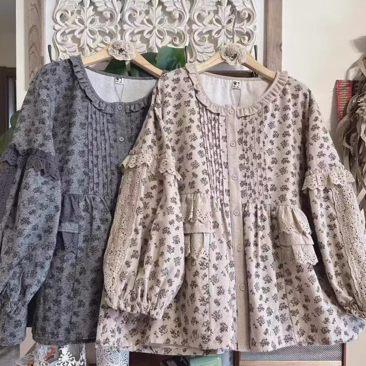 ラウンドネックレトロチェック柄ブラウス ・8142