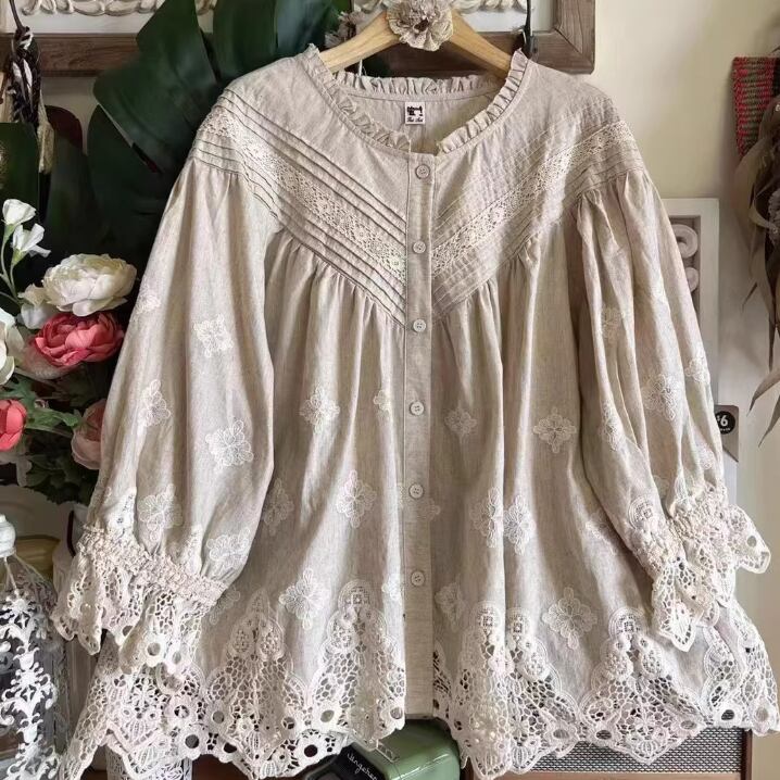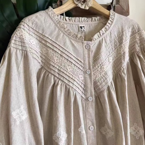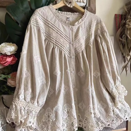 ラウンドネックレトロチェック柄ブラウス ・8142