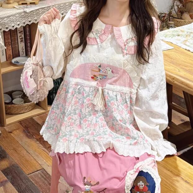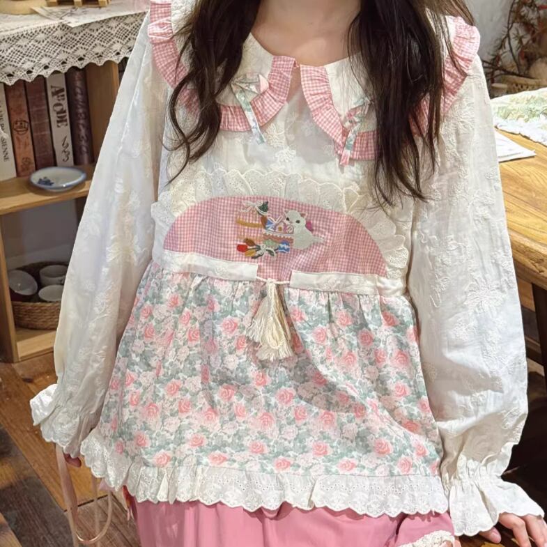 ラウンドネックレトロチェック柄ブラウス ・8142