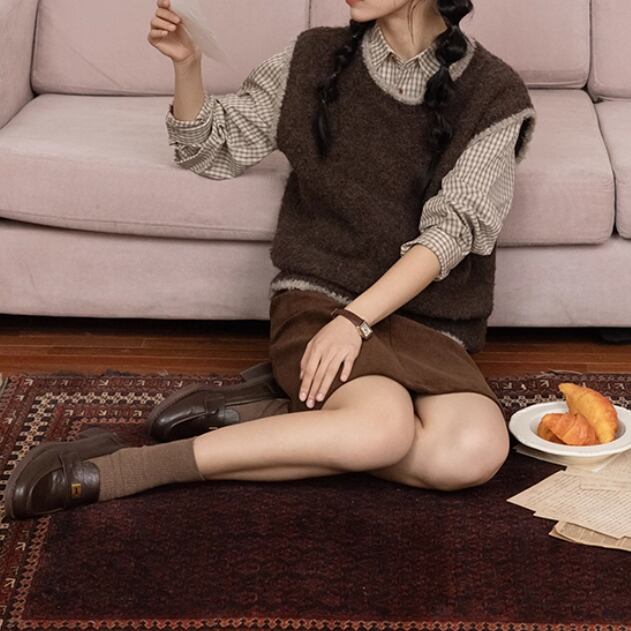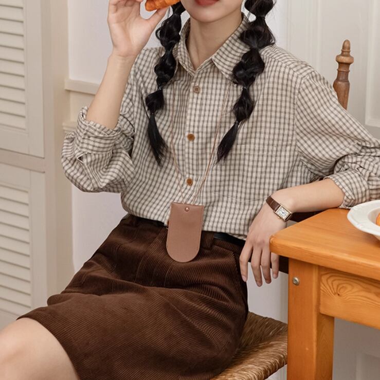 ラウンドネックレトロチェック柄ブラウス ・8142
