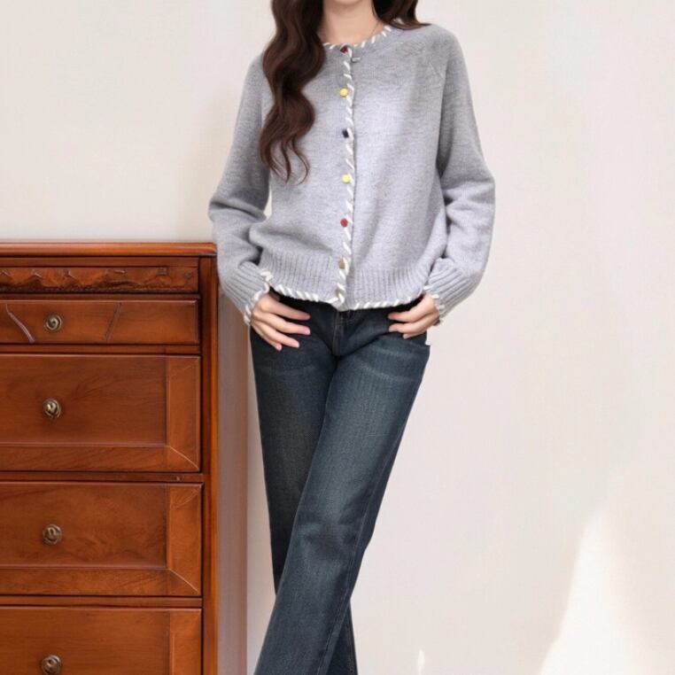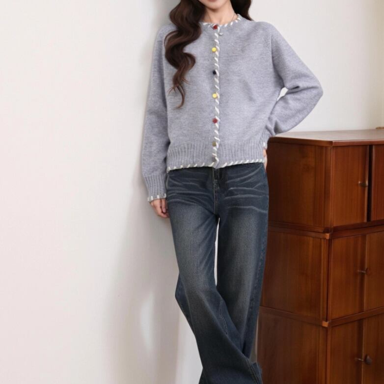 フラワー刺繍ラインニットカーデ ・9605