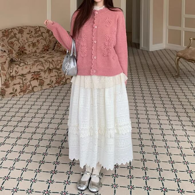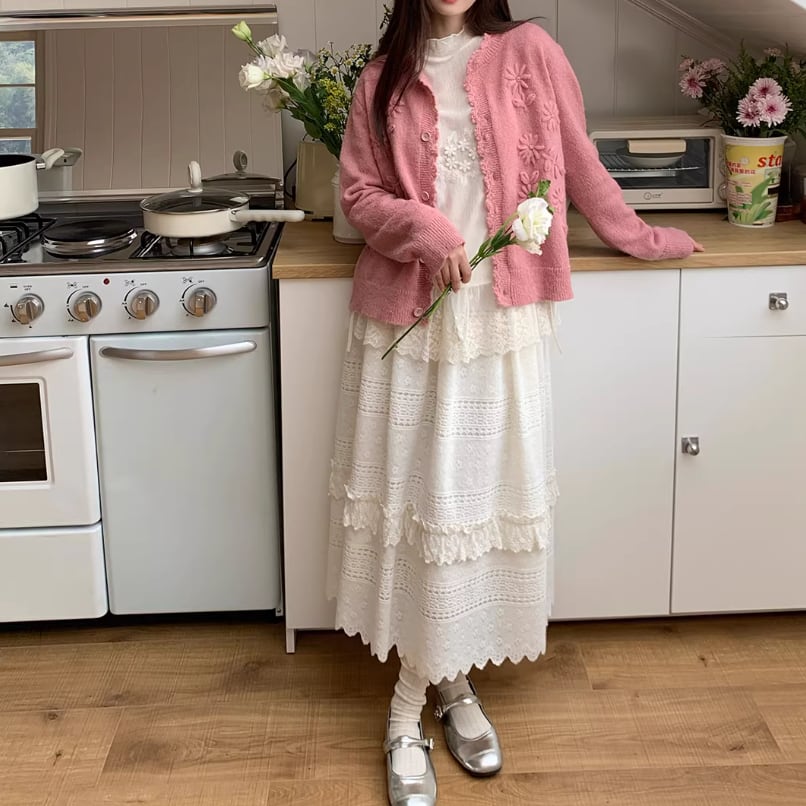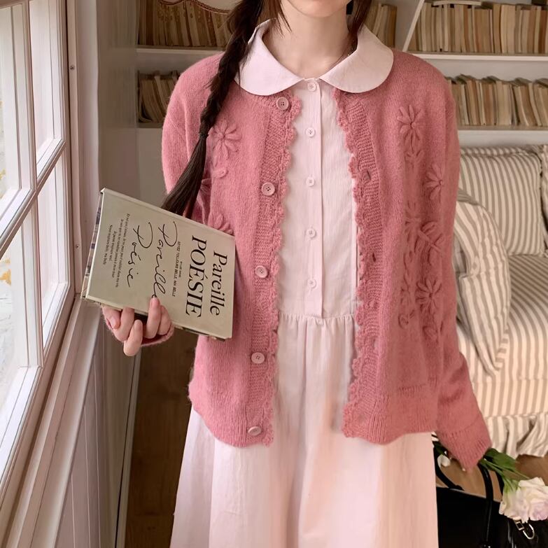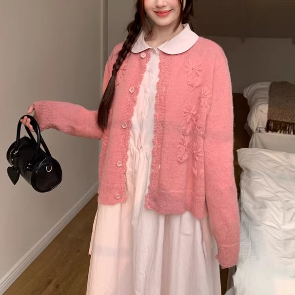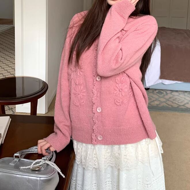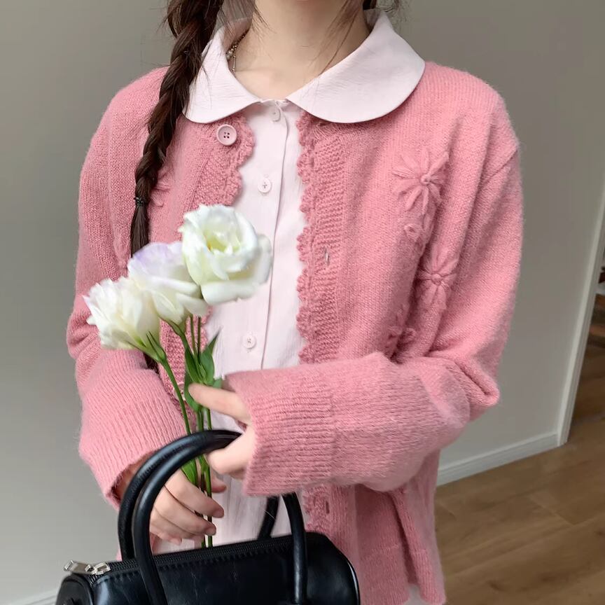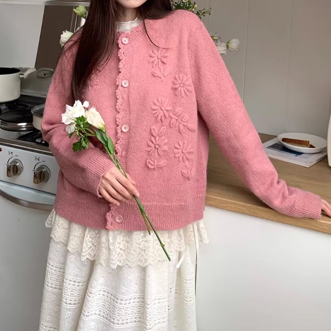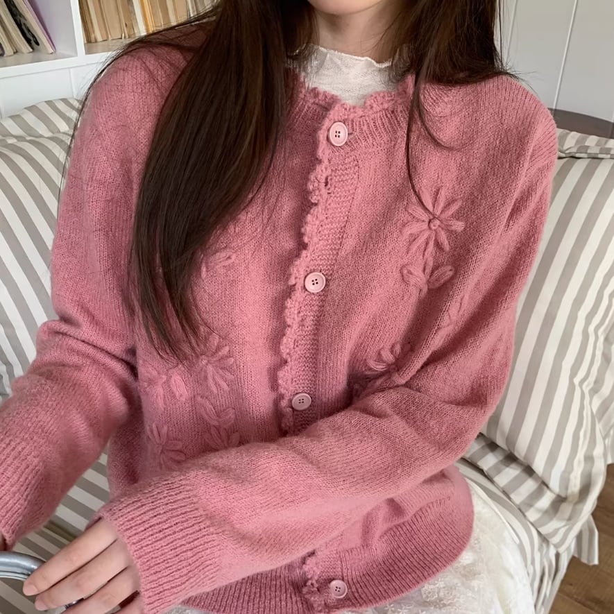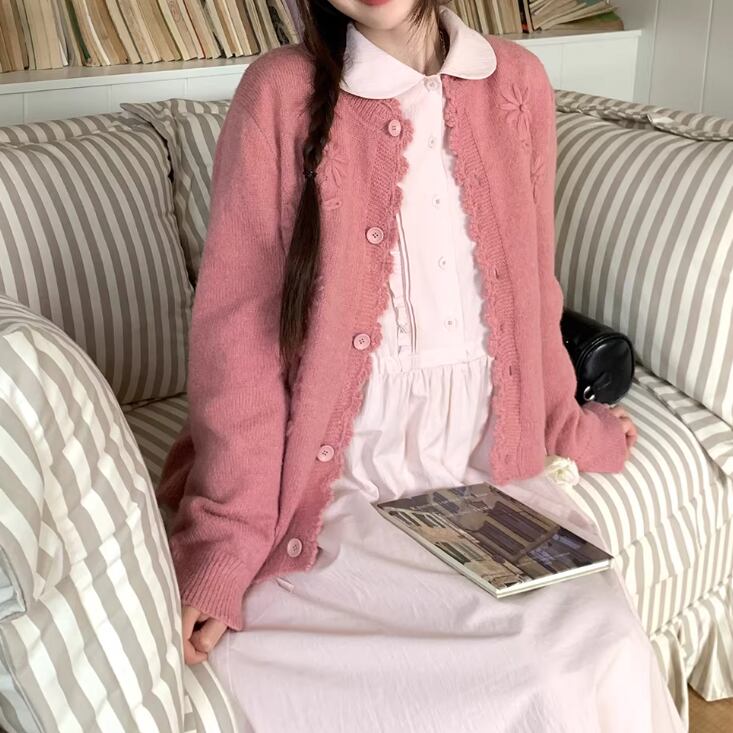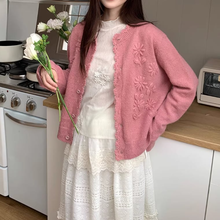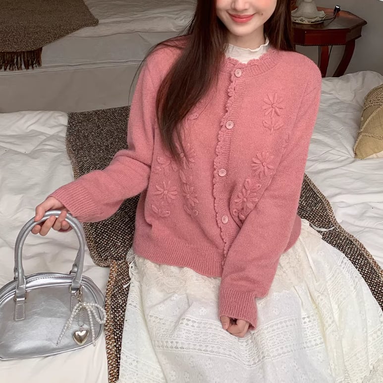3色/フラワー刺繍ニットカーデ ・8907