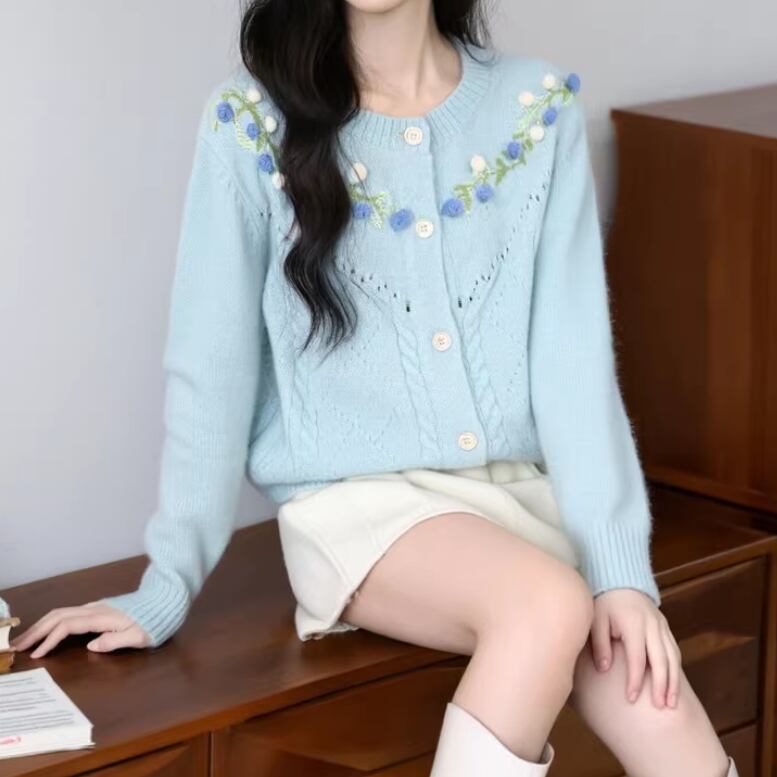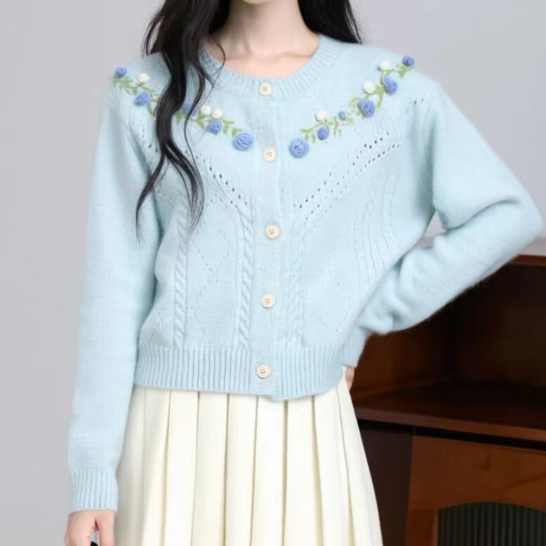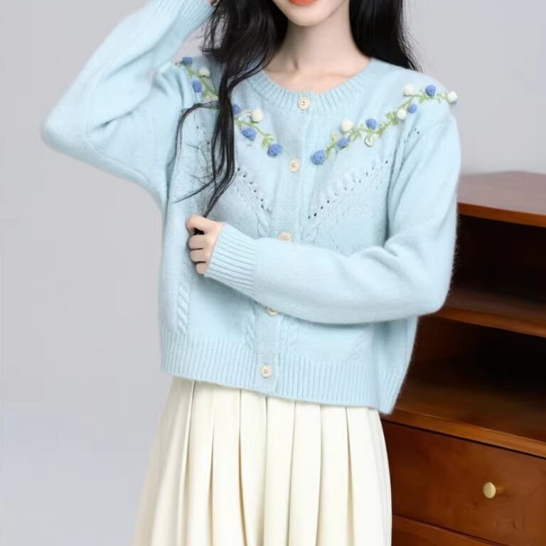 3色/フラワー刺繍ニットカーデ ・8907