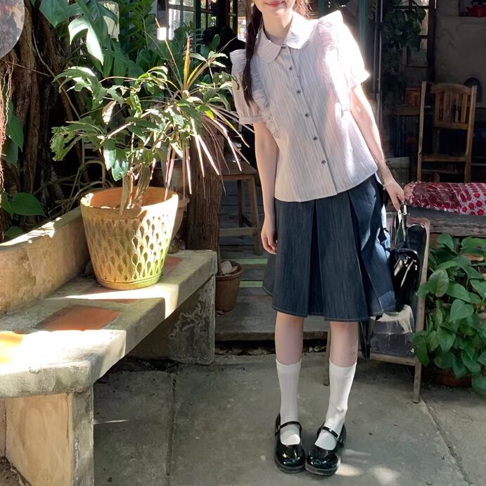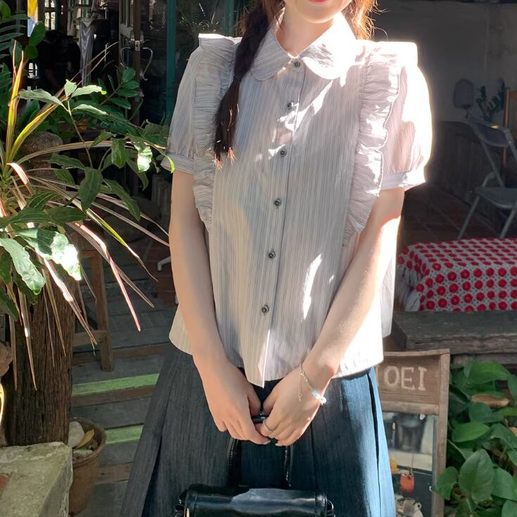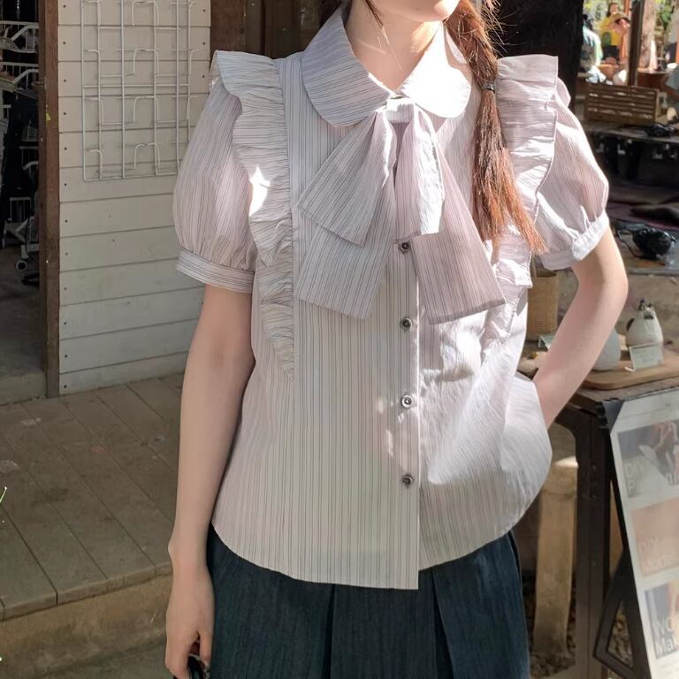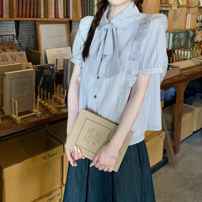 ラウンドネックレトロチェック柄ブラウス ・8142