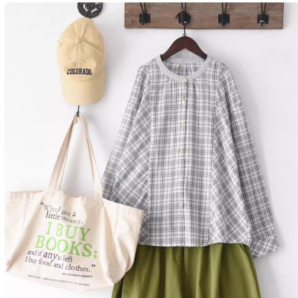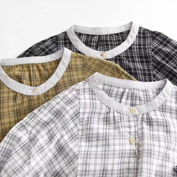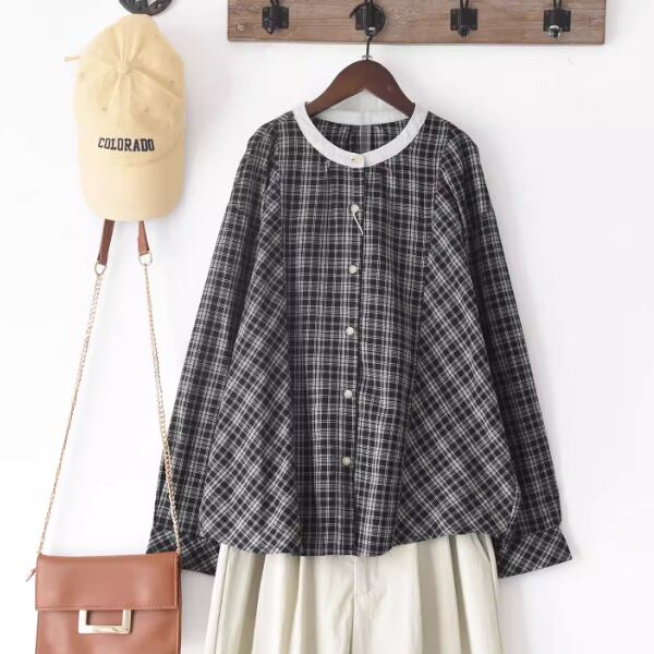 ラウンドネックレトロチェック柄ブラウス ・8142