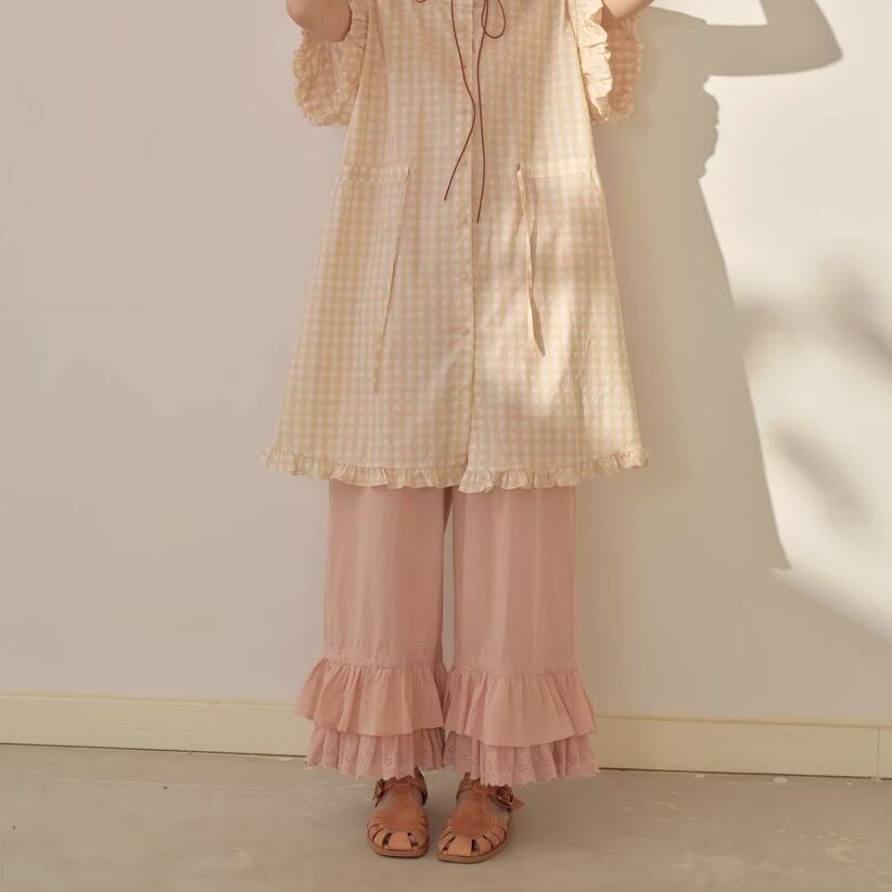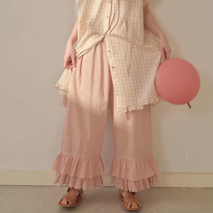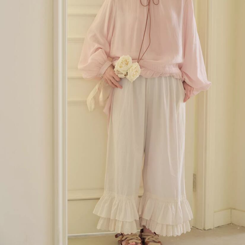2色/裾フリルデザイン刺繍パンツ ・7790