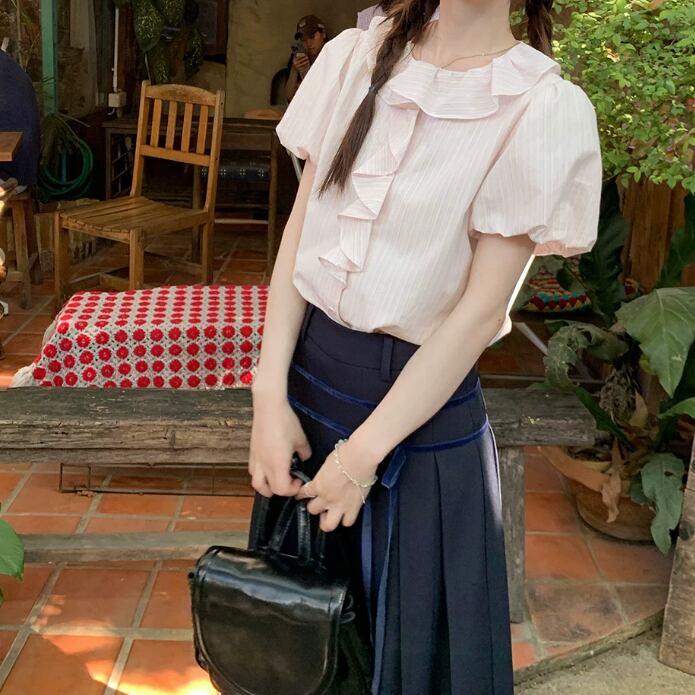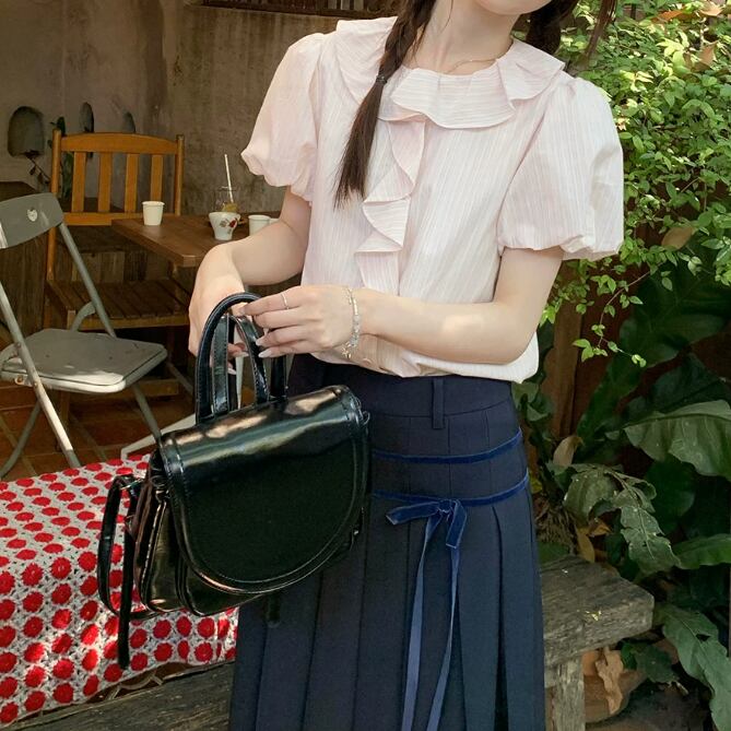2色/フリルネックギャザーブラウス ・8577